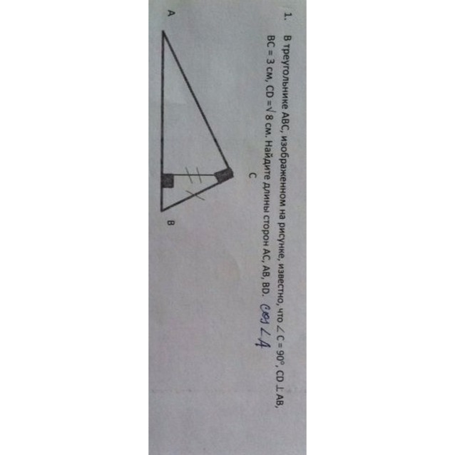 ВД=√СВ²-СД²=√3²-(√8)²=√9-8=1см, по соотношениям в прямоугольном треугольнике СД²=АД*ВД, (√8)²=АД*1, АД=8см, АВ=АД+ВД=8+1=9 см, АС=√АВ²-ВС²=√9²-3²=√81-9=√72=6√2 см, cosA=AC/AB=6√2/9=2√2/3