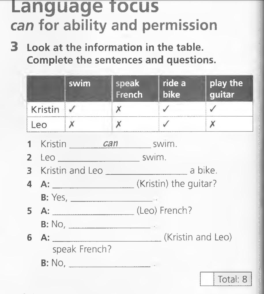 3 Look at the information Complete the sentences Kristin ✔ Leo X 1 2 Leo 3 4 Kristin Kristin and Leo A: B: Yes, 5 A: B: No, swim 6 A: B: No, speak French? speak French X X can in the table. and questions. ride a bike ✓ swim. swim. play the guitar ✓ (Leo) French? X a bike. (Kristin) the guitar? (Kristin and Leo) Total: 8 des