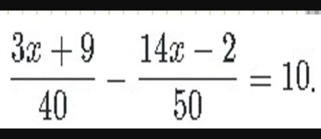 the fraction with numerator 3 x plus 9 and denominator 40 end fraction minus the fraction with numerator 14 x minus 2 and denominator 50 end fraction equals 10