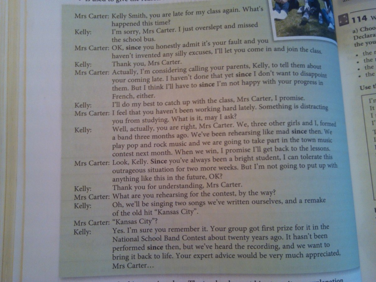 Келли: Что же, в общем вы правы Миссис Картер. Мы, три других девочки и я, создали группу три месяца назад. Мы репетировали как сумасшедшие с тех пор. Мы играем поп и рок музыку, и мы собираемся принять участие в городском концерте в следующем месяце. Когда мы выиграем я обещаю, я вновь приступлю к занятиям.