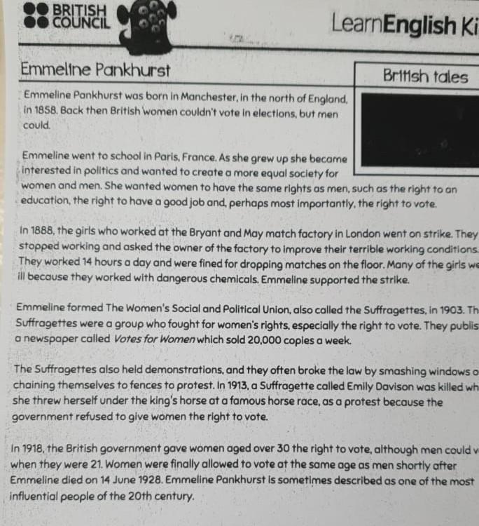 Emmeline Pankhurst was born in 1858, when British women couldn't vote in elections. In 1888, the girls at the Bryant and May match factory in London went on strike. Emmeline formed The Women's Social and Political Union in 1903. They published a newspaper called Votes for Women and held demonstrations. They fought for women's rights, especially the right to vote. In 1918, the British government gave women aged over 30 the right to vote. Women were finally allowed to vote at the same age as men in 1928. She wanted women to have the same rights as men.