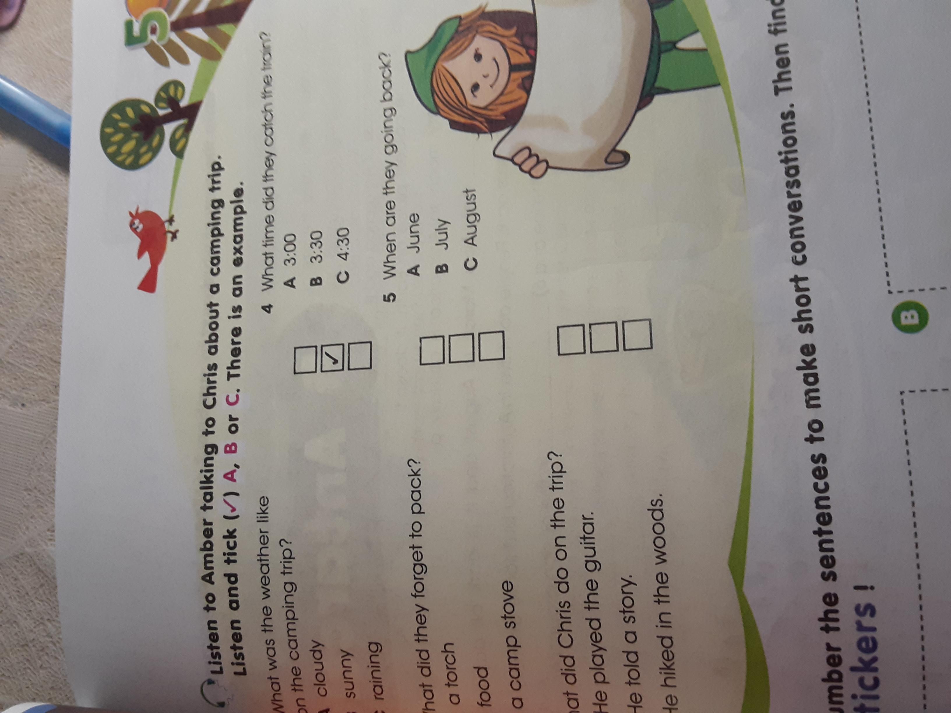 Listen to Amber Talking to Chris about a camping trip. Listen and tisk ( \/ ) A B or C. There is an example.