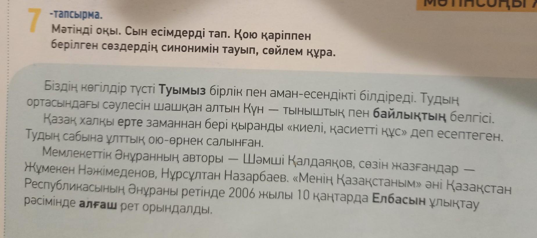 -тапсырма. 7 Мәтінді оқы. Сын есімдерді тап. Қою қаріппен берілген сөздердің синонимін тауып, сөйлем құра. Біздің көгілдір түсті Туымыз бірлік пен аман-есендікті білдіреді. Тудың ортасындағы сәулесін шашқан алтын күн ТЫНЫШТЫҚ ПЕН байлықтың белгісі. Казак халкы ерте заманнан бері қыранды «киелі, қасиетті кұс» деп есептеген. Тудың сабына ұлттық ою-өрнек салынған. Мемлекеттiк Әнұранның авторы Шәмші Қалдаяқов, сөзін жазғандар Жұмекен Нәжімеденов, Нұрсұлтан Назарбаев. «Менің Қазақстаным» әні Қазақстан Республикасының Әнұраны ретінде 2006 жылы 10 қаңтарда Елбасын ұлықтау рәсімінде алғаш рет орындалды. - - -