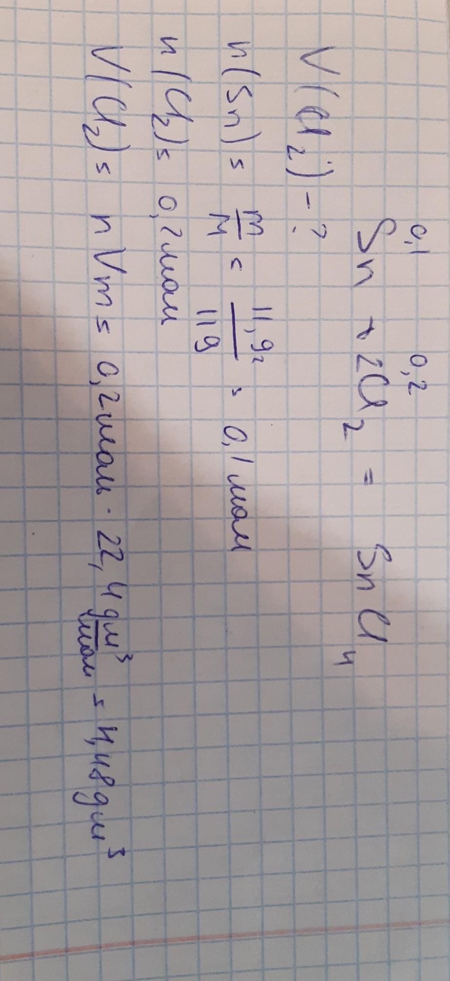 Более половины мирового производства олова идет на лужение консервных банок (железо, покрытое оловом). Чтобы регенерировать олово из использованных банок, их обрабатывают сухим хлором. В отсутствие влаги реагирует с хлором только олово, образуя жидкий хлорид олова (IV) SnCl. Вычисли обьем хлора (н.у.), необходимый для реакции с оловом массой: а) 11,9 г;