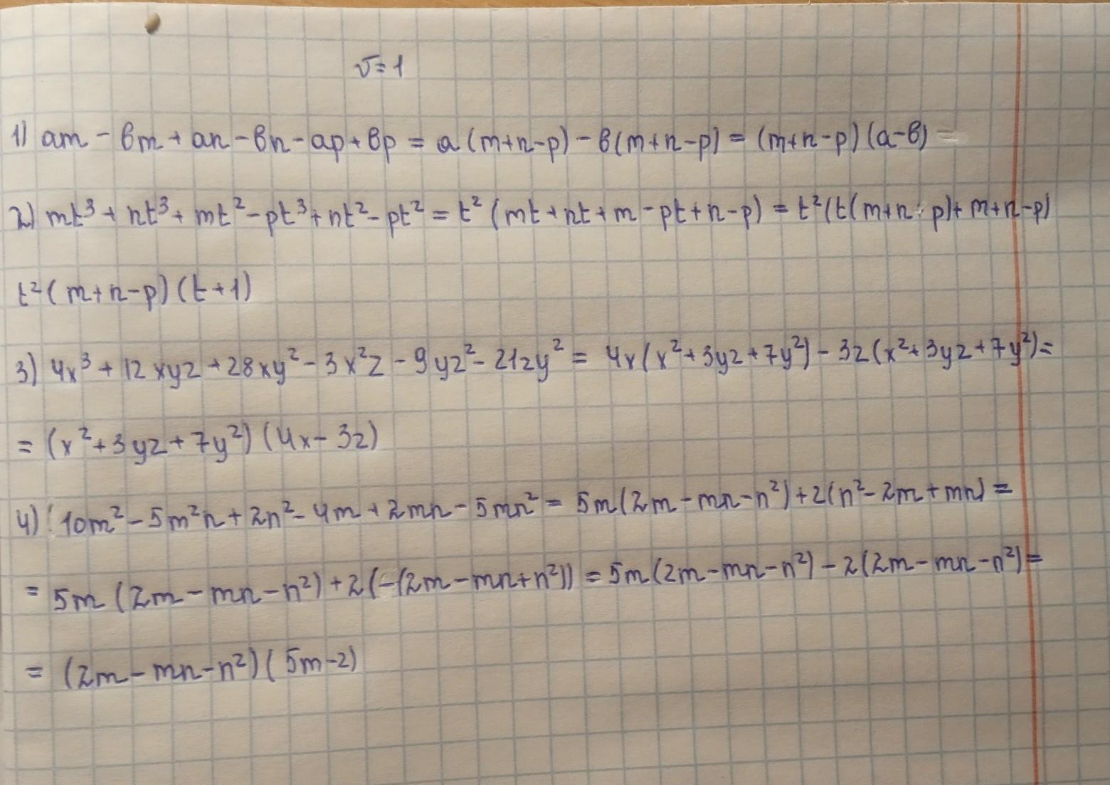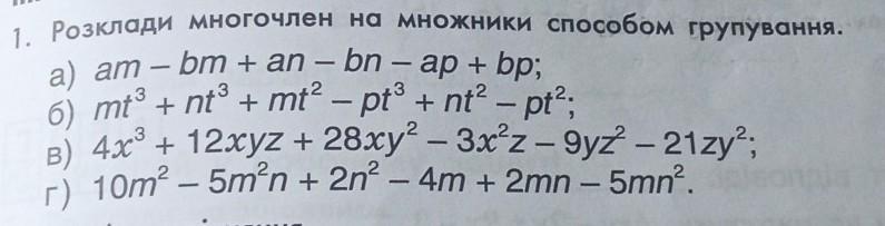 1. Розклади многочлен на множники способом групування. a) am - bm + an - bn - ap + bp; 6) mt3 + nt3 + mt2 - pt3 + nt2 - pt²; - - B) 4х³ + 12xyz + 28xy² - 3x²z - 9yż - 21zy²; 10m² - 5m²n + 2n² - 4m + 2mn - 5mn². ПЖПЖПЖ ДАЮ 50 балов