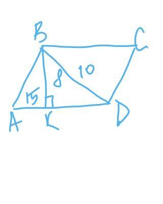 В параллелограмме ABCD проведена высота ВК, которая делит сторону AD на отрезки АК и KD.Найти стороны параллелограмма, если ВК = 8 см, АК = 15 см, BD = 10 см.