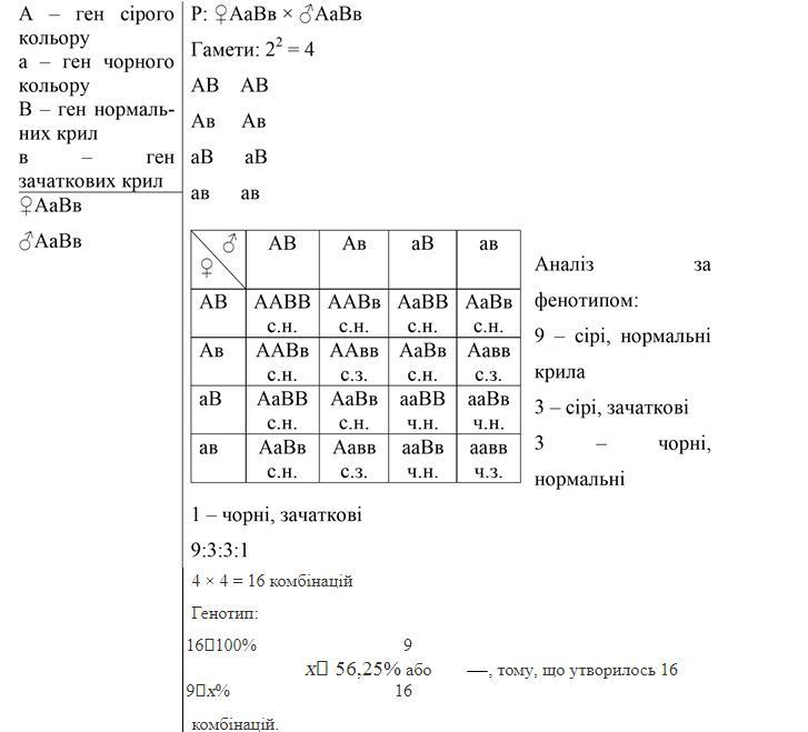 за цією решіткою ми бачимо, що у потомстві одержано розщеплення за фенотипом — 9 : 3 : 3 : 1. Відповідь: у потомстві відбудеться розщеплення ознак за генотипами AАBВ, AАBb, AaBВ, AaBb, AАbb, Aabb, aaBВ, aaBb, aabb. Кожна пара альтернативних варіантів ознак успадковується незалежно від інших пар і дає розщеплення 3 : 1 по кожній парі (як і при моногібридному схрещуванні). За фенотипами відбудеться розщеплення у співвідношенні 9 : 3 : 3 : 1, а саме: 9 сірі довгокрилі : 3 сірі короткокрилі : 3 чорні довгокрилі: 1 чорна короткокрила.