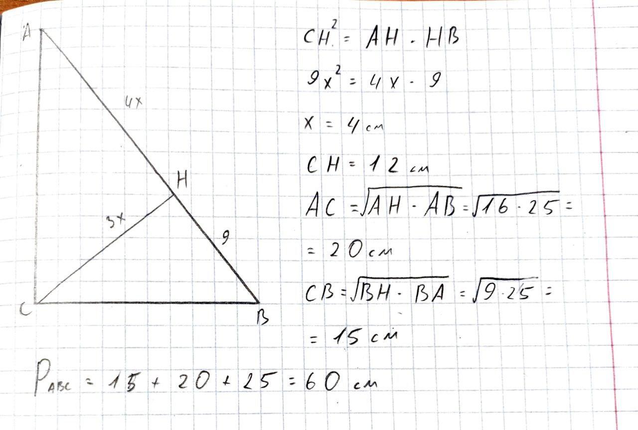 Висота проведена з вершини прямого кута прямокутного трикутника до гіпотенузи,ділить її на відрізки, один з яких дорівнює 9см, а другий відноситься до висоти,як 4:3