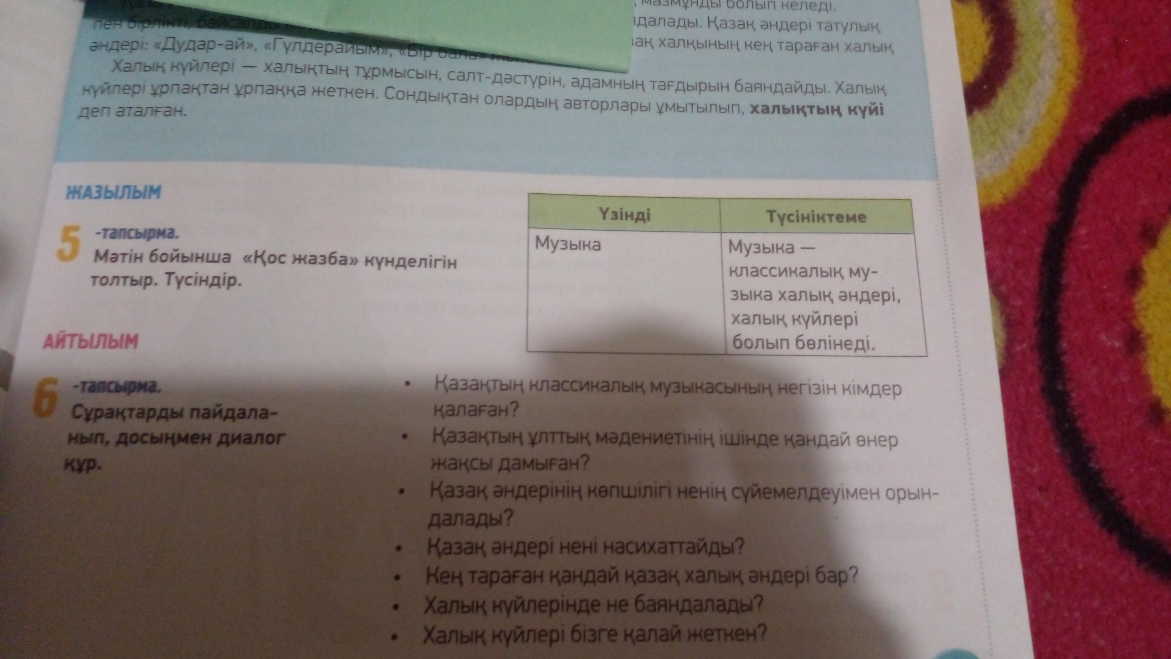 5- тапсырма . Мəтін бойынша 《 Қос жазба 》 күнделігін толтыр . Түсіндір.