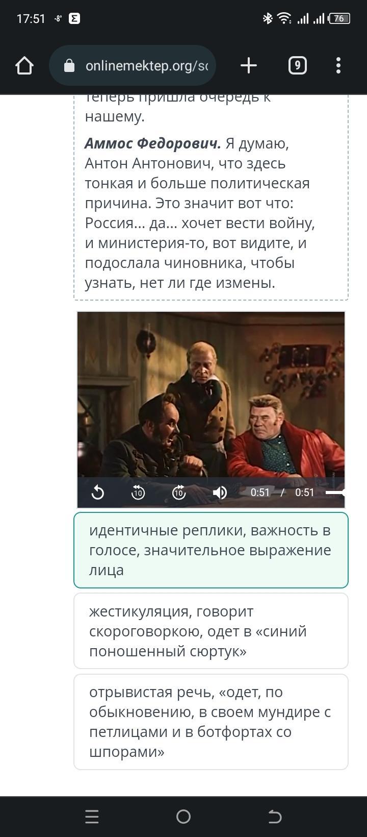 Сопоставь фрагмент комедии Н.В. Гоголя «Ревизор» и видеофрагмент экранизации Владимира Петрова. Найди сходство в раскрытии образа Аммоса Федоровича в разных видах искусства (литература и кинематограф). Посмотреть текст идентичные реплики, важность в голосе, значительное выражение лица отрывистая речь, «одет, по обыкновению, в своем мундире с петлицами и в ботфортах со шпорами» жестикуляция, говорит скороговоркою, одет в «синий поношенный сюртук»