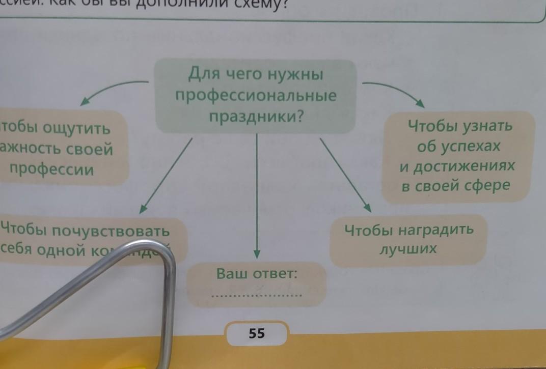люди любят праздники, связанные со своей фессией. Как бы вы дополнили схему? Чтобы ощутить Важность своей профессии Чтобы почувствовать себя одной конд Для чего нужны профессиональные праздники? Ваш ответ: 55 про- Чтобы узнать об успехах и достижениях в своей сфере Чтобы наградить лучших