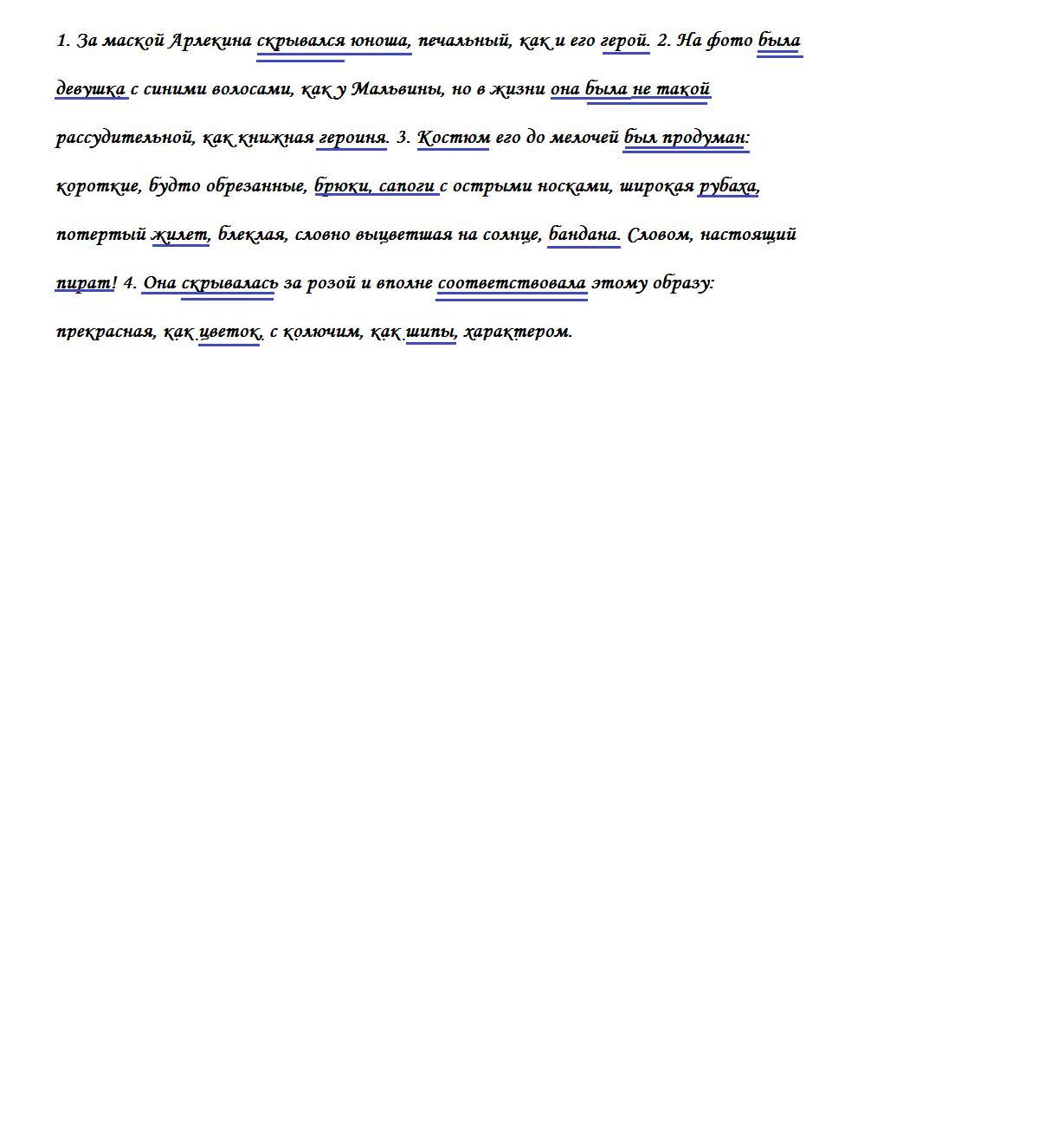 Подчеркнуть все грамматические основы. 1. За маской Арлекина скрывался юноша, печальный, как и его герой. 2. На фото была девушка с синими волосами, как у Мальвины, но в жизни она была не такой рассудительной, как книжная героиня. 3. Костюм его до мелочей был продуман: короткие, будто обрезанные, брюки, сапоги с острыми носками, широкая рубаха, потертый жилет, блеклая, словно выцветшая на солнце, бандана. Словом, настоящий пират! 4. Она скрывалась за розой и вполне соответствовала этому образу: прекрасная, как цветок, с колючим, как шипы, характером.