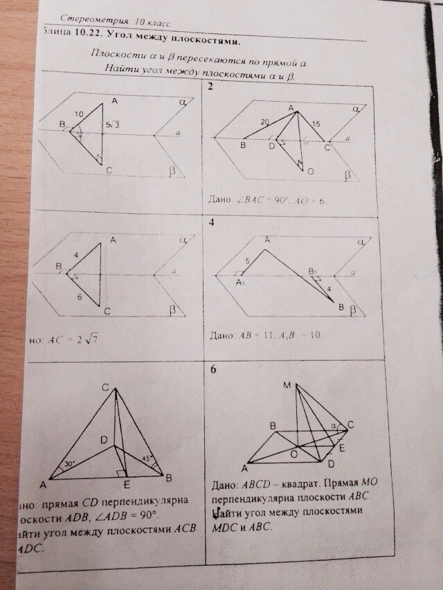 6) аналогично в этой задаче, диагонали пересек под прям углом, углы при пересеч диагон сторона=45 град, ОМ перпенд плоскости АВС, тогда треугМСО-проекция трех плоскостей, т.к. МО перп АВС, МОД перп АВС и МОС, тогда угол между плоскостями =α.