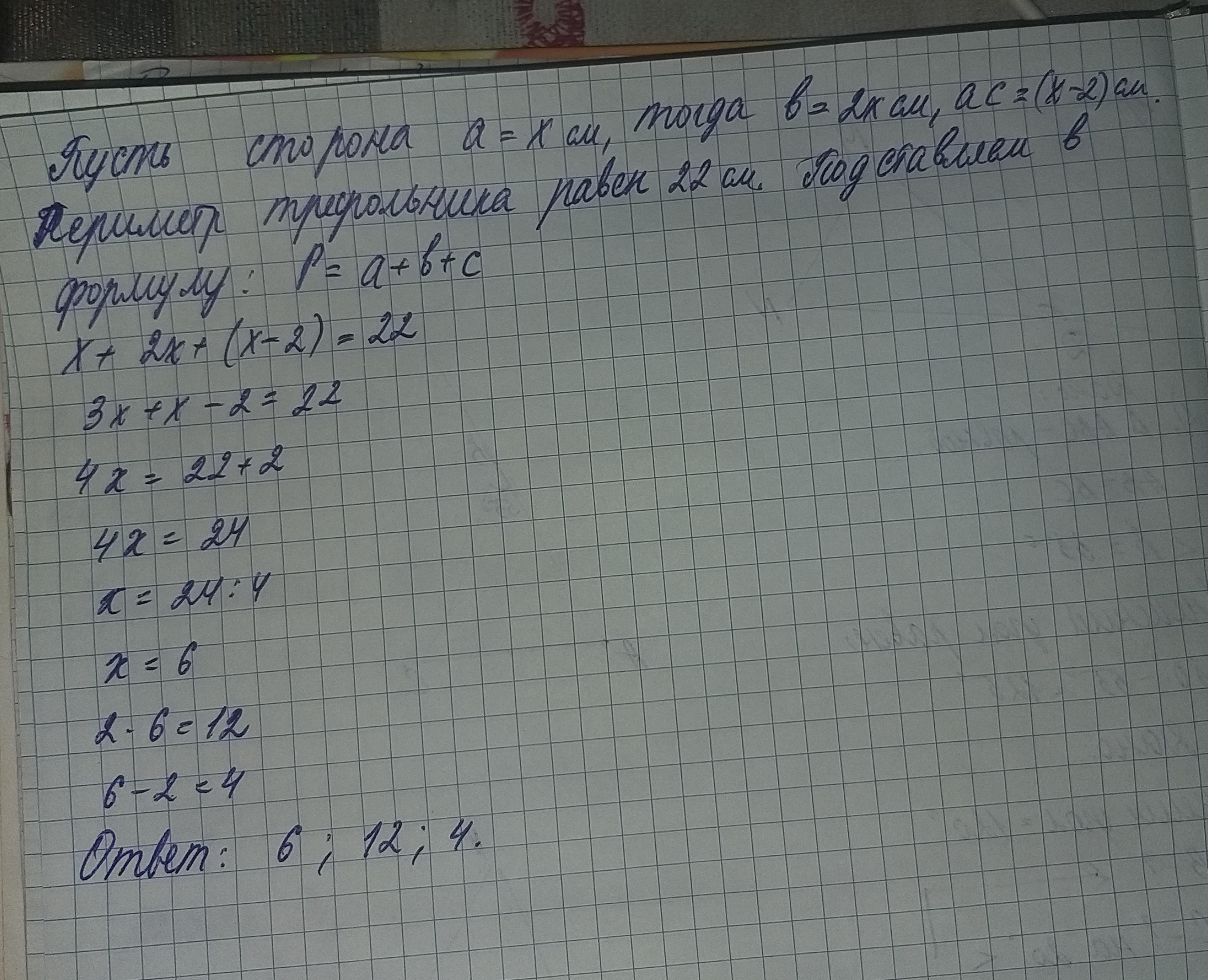 Одна із сторін трикутника вдвічі менша за другу та на 2 см більша третьої. Периметр трикутника 22 см. Знайдіть сторони цього трикутника. Розв'язок відправити на перевірку. відповіді: 6 12 8 4