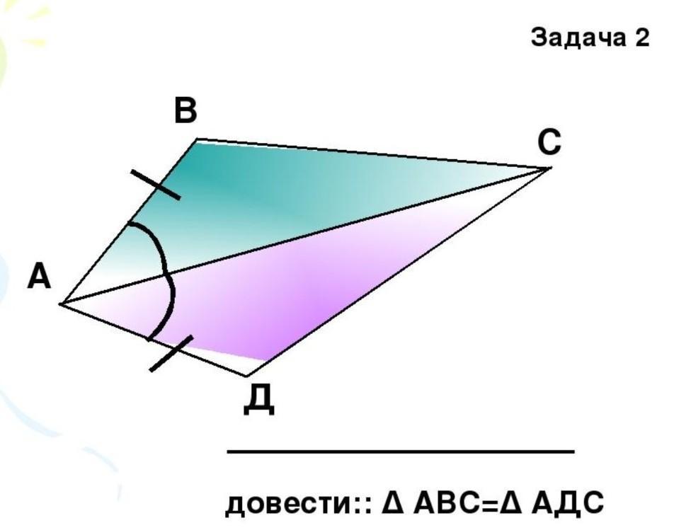дано: 2 трикутника з парою рівних сторін, спільної стороною і 2 рівних кути