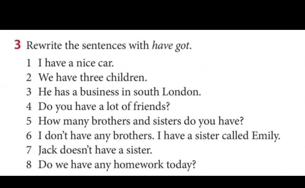 3 Rewrite the sentences with have got. 1 I have a nice car. 2 We have three children. 3 He has a business in south London. 4 Do you have a lot of friends? 5 How many brothers and sisters do you have? 6 I don't have any brothers. I have a sister called Emily. 7 Jack doesn't have a sister. 8 Do we have any homework tоday?