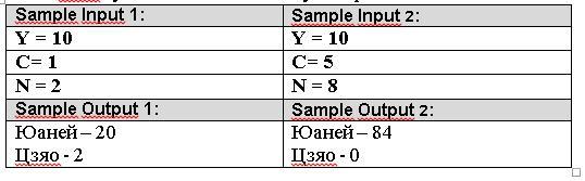 Олимпийский сувенир стоит Y юаня и C цзяо (где 0 ≤ C ≤ 9). Определите, сколько юаней и цзяо нужно заплатить за N сувениров.
