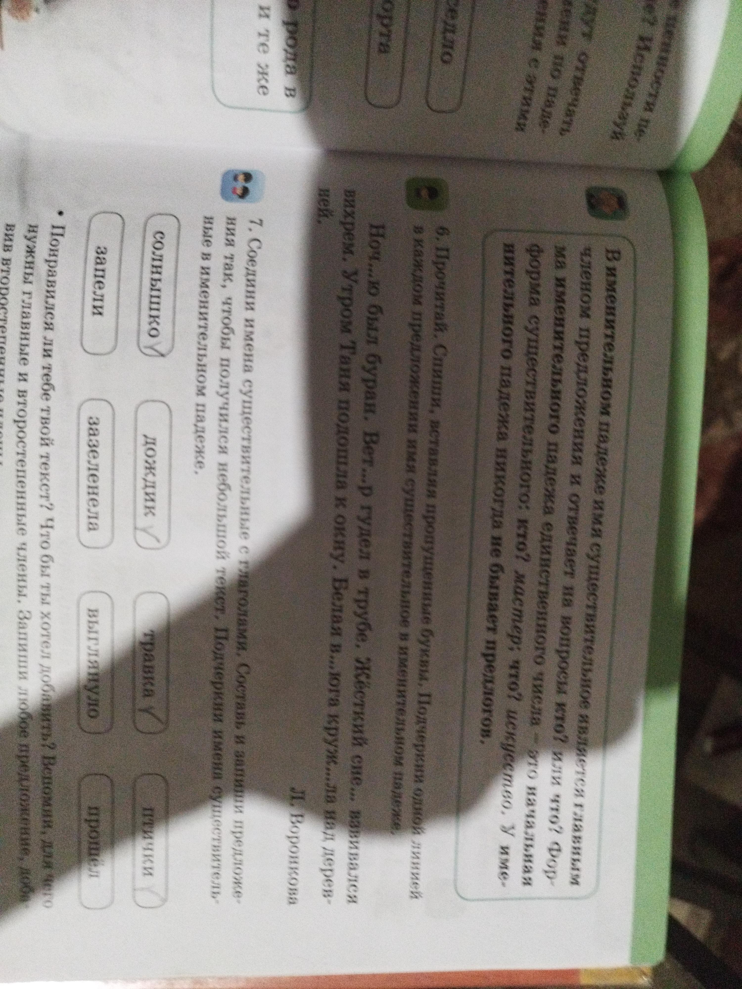 Ночью был буран(И п). Ветер(И.п) гудел в трубе. Жёсткий снег(И.п) взвивался вихрем. Утром Таня(И.п) подошла к окну. Белая вьюга(И.п) кружила над деревней.