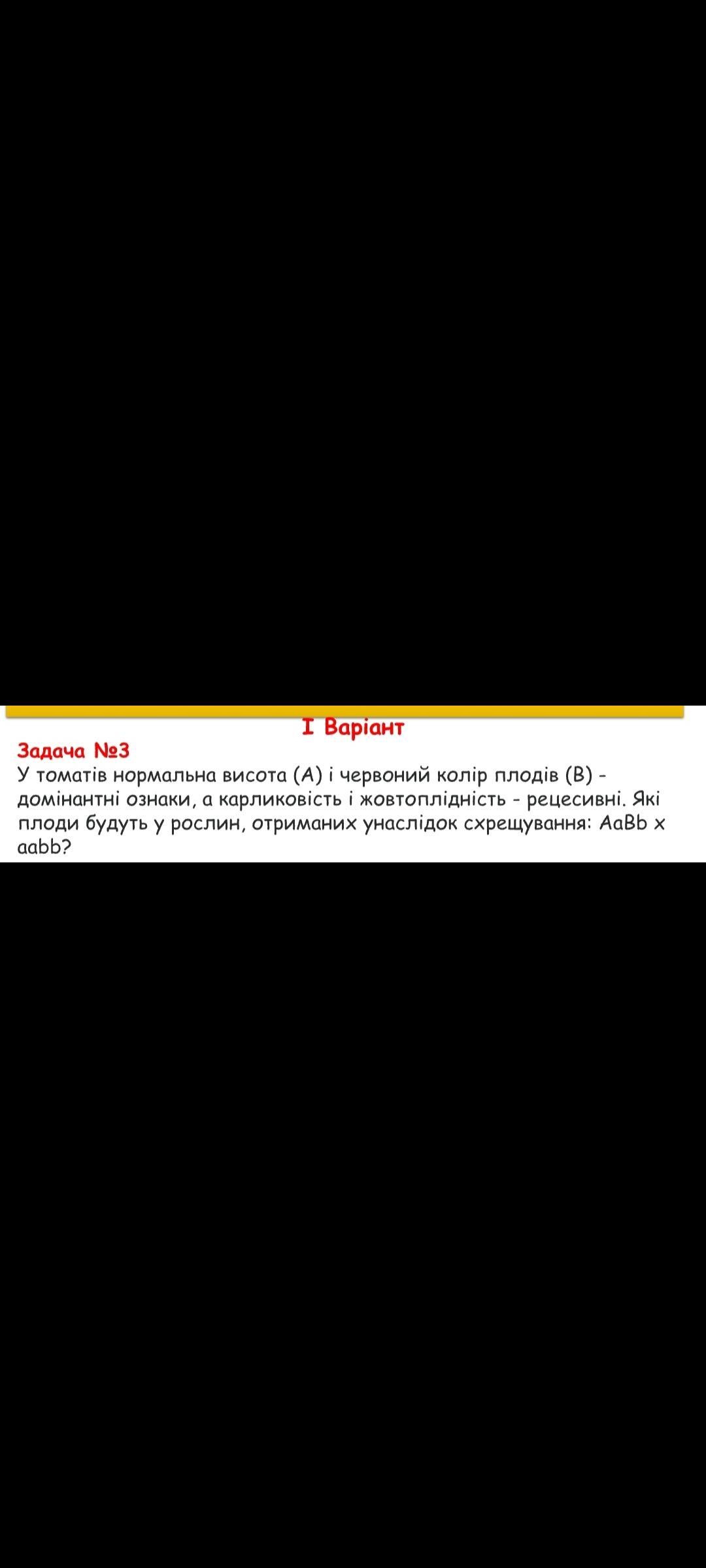 за фенотипом 25% – з нормальною висотою і червоним кольором плодів, 25% – з нормальною висотою і жовтим кольором плодів, 25% – з карликовою висотою і жовтим кольором плодів, 25% – з карликовою висотою і червоним кольором плодів.