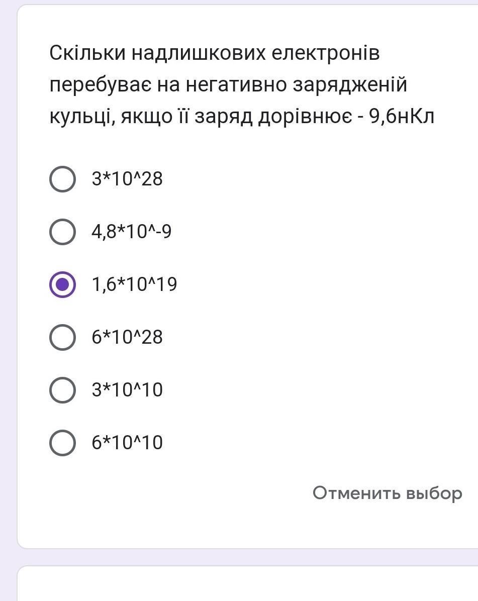 n=q/e=9,6*10^(-9)/(1,6*10^(-19)= 9,6/1,6 * 10^(-9+19)=6*10^10. Это ответ.