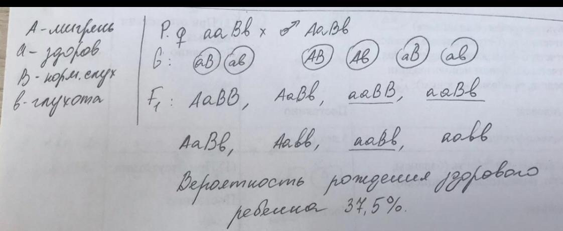 Батько хворіє на мігрень (домінантна ознака), а мати здорова. У батька нормальний слух, у матері – також, але вона має рецесивну алель глухоти. Яка ймовірність народження у них здорової дитини, якщо батько гетерозиготний за обома генами?