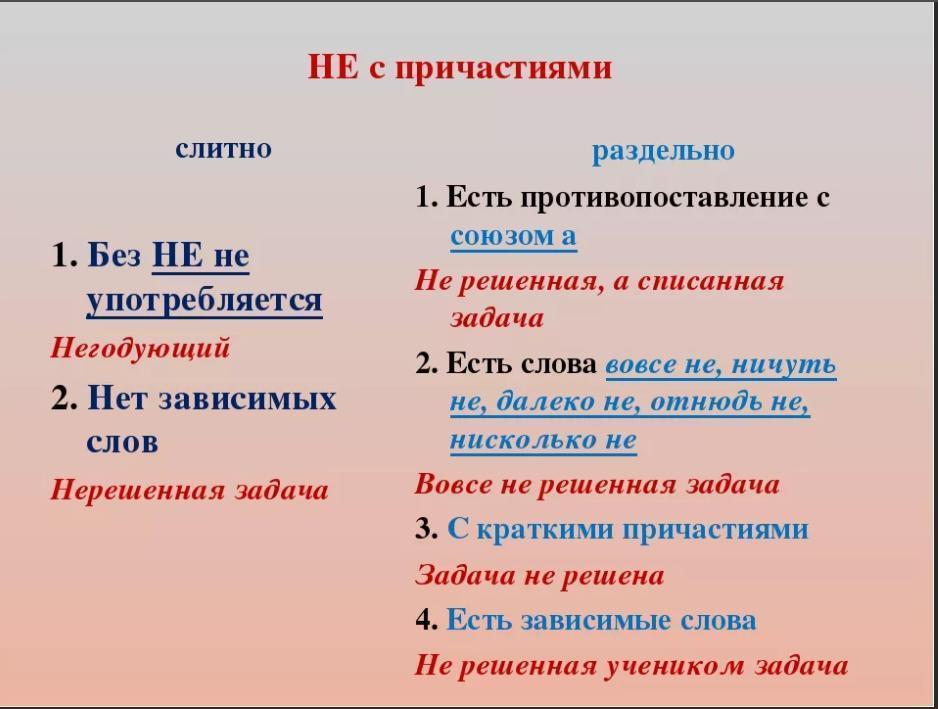 Ниже приведена таблица "частица не с причастиями"
