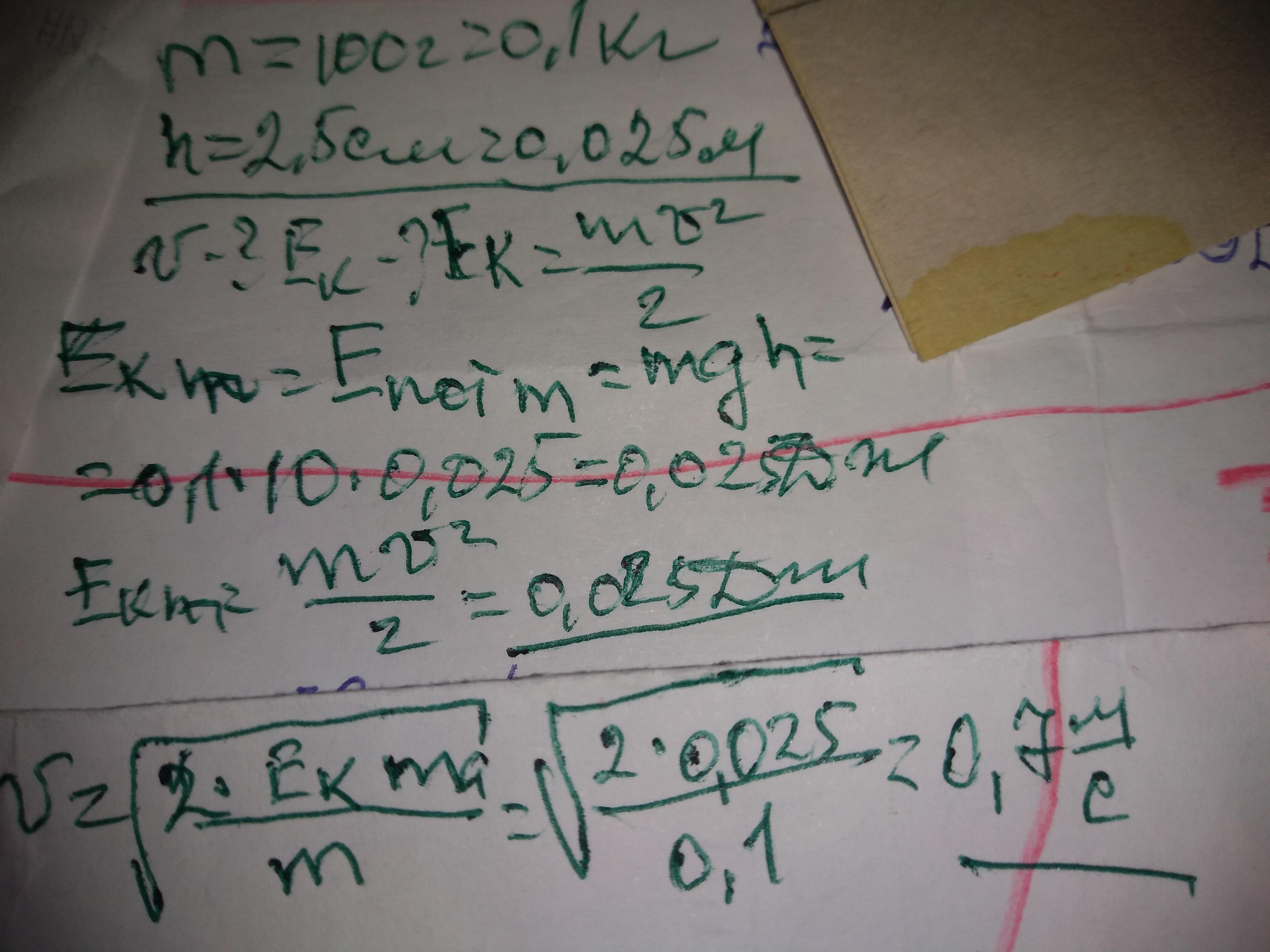шарик массой 100г совершает колебание на нити.найдите скорость и кинетическую энергию шарика в точке равновесия,если центр тяжести шарика при его максимальном отклонении находится выше точки равновесия на 2,5 см.