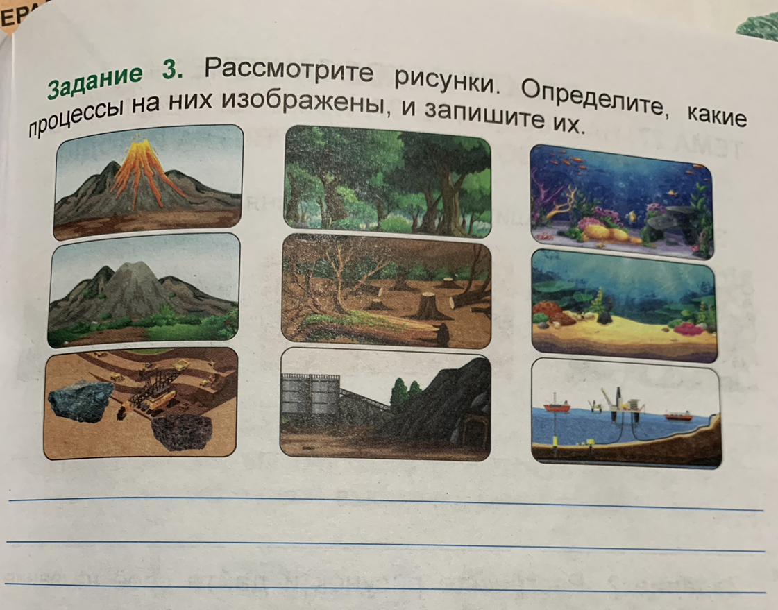 Объяснение: на картинках изображены как извержения вулканов так и вырубка лесов и добыча ресурсов