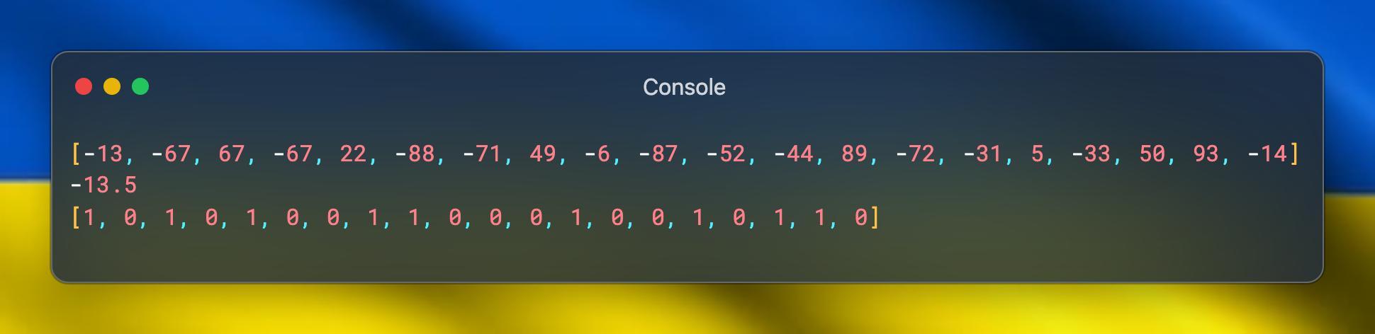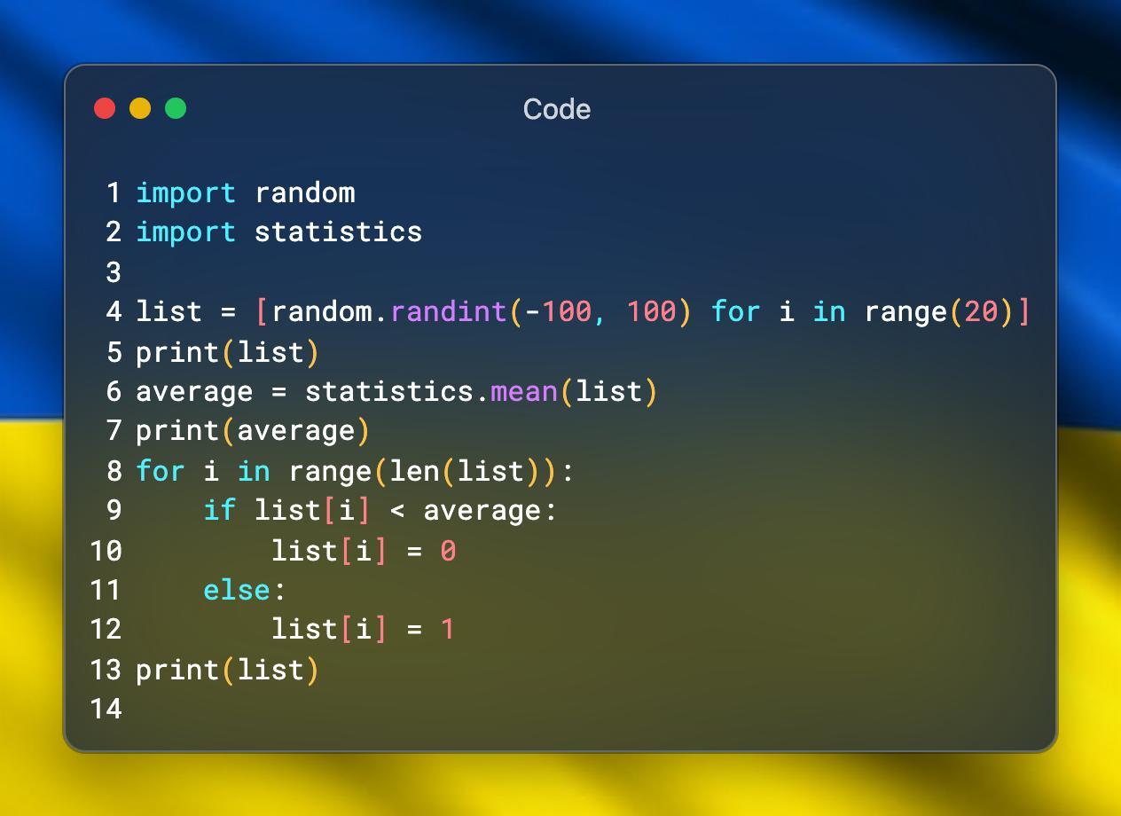 *Спочатку потрібно знайти середнє значення списку. Тоді перебирати елементи за їх номерами (лише так ми зможемо їх змінювати). Якщо поточний елемент менший за середнє значення - то цей елемент стає 0, інакше - 1.