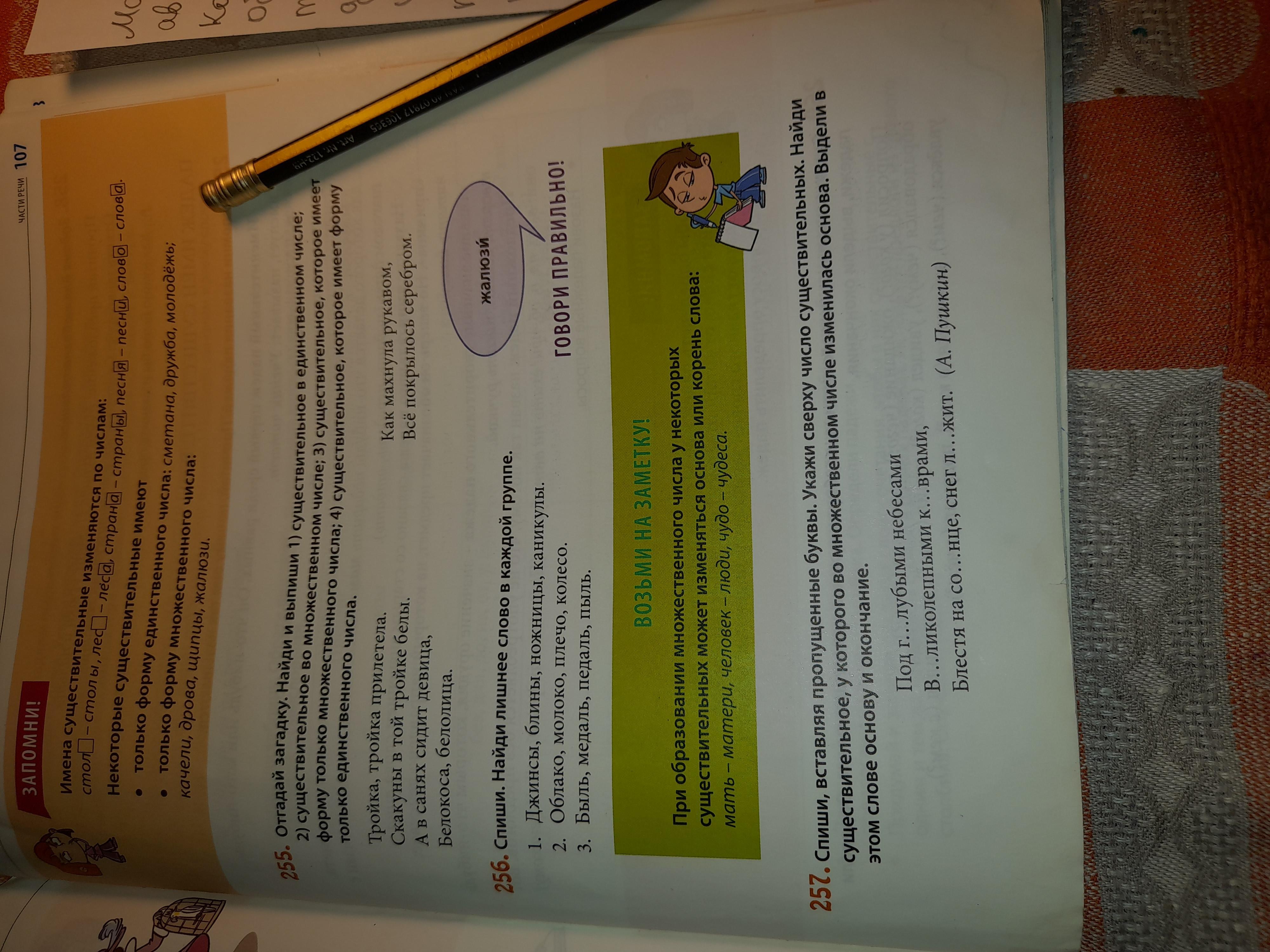 Спиши,вставляя пропущенные буквы.Укажи сверху число существительных.Найди существительное,у которого во множественном числе изменилась основа. Выдели в этом слове основу и окончание. Упражнение номер 257