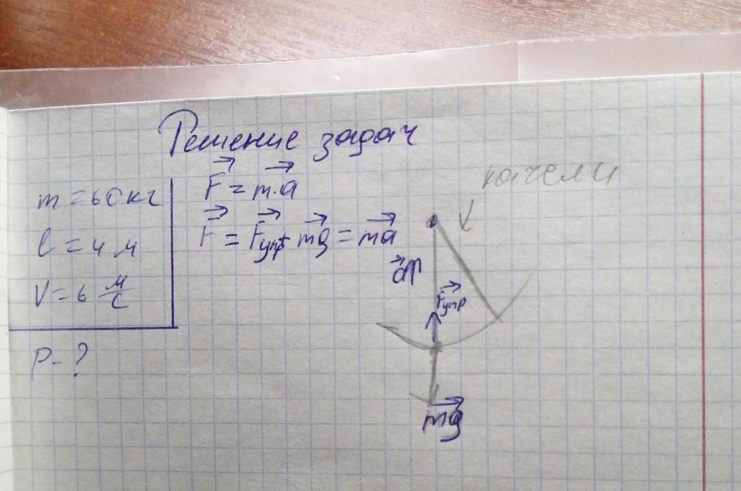P=m(g- V^2/l) = 60 кг * ( 10 Н/кг - 6^2 м/с / 4 м ) = 60Н