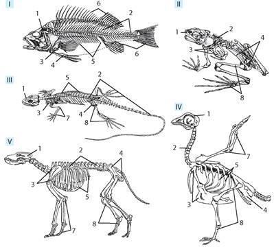 СРОЧНО! Розгляньте малюнки із зображеннями скелетів різних хребетних тварин.Вкажіть під якими цифрами позначені: череп, лопатка, грудина, кістки задньої кінцівки, хребет, кістки передньої кінцівки.