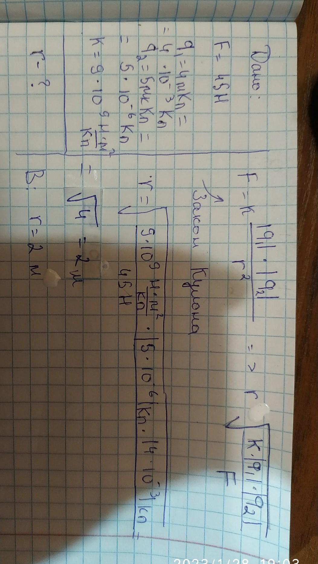Сила взаємодії між двома точковими зарядами 4мКл і 5мкКл дорівнює 45Н. Яка відстань між зарядами?