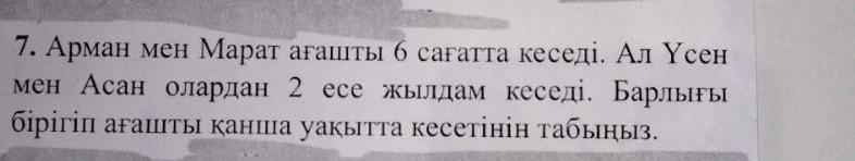 Пошаговое объяснение: если Арман и Марат рубили за 6 часов, а Усен и Асан в 2 раза быстрее, то 6:2=3(часа)-рубили Усен и Асан, значит второе действие 6+3=9 (часов)-рубили в четвером.
