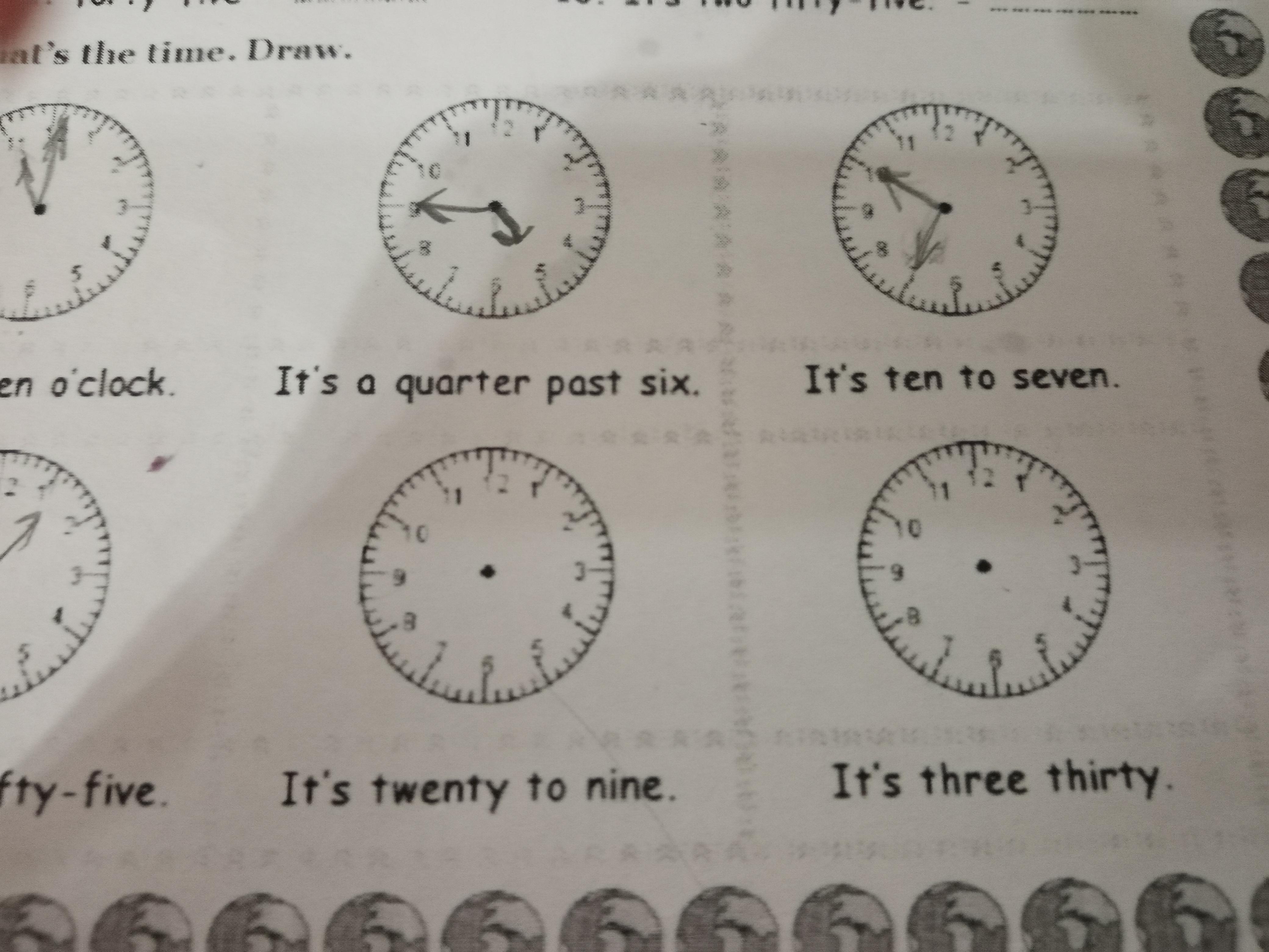It's three thirty -длинная (минутная) стрелка на 6; короткая (часовая) стрелка ровно посередине между 3 и 4