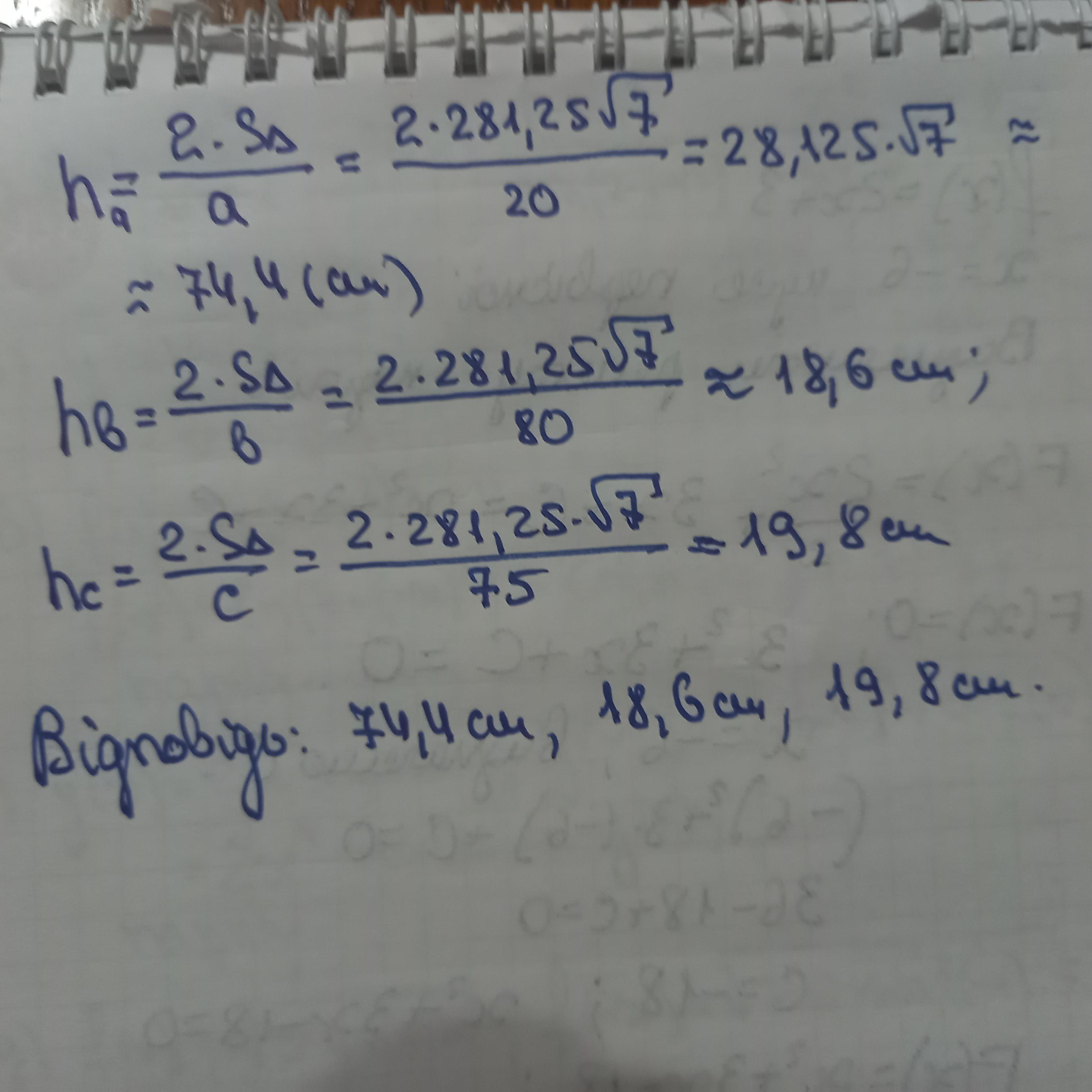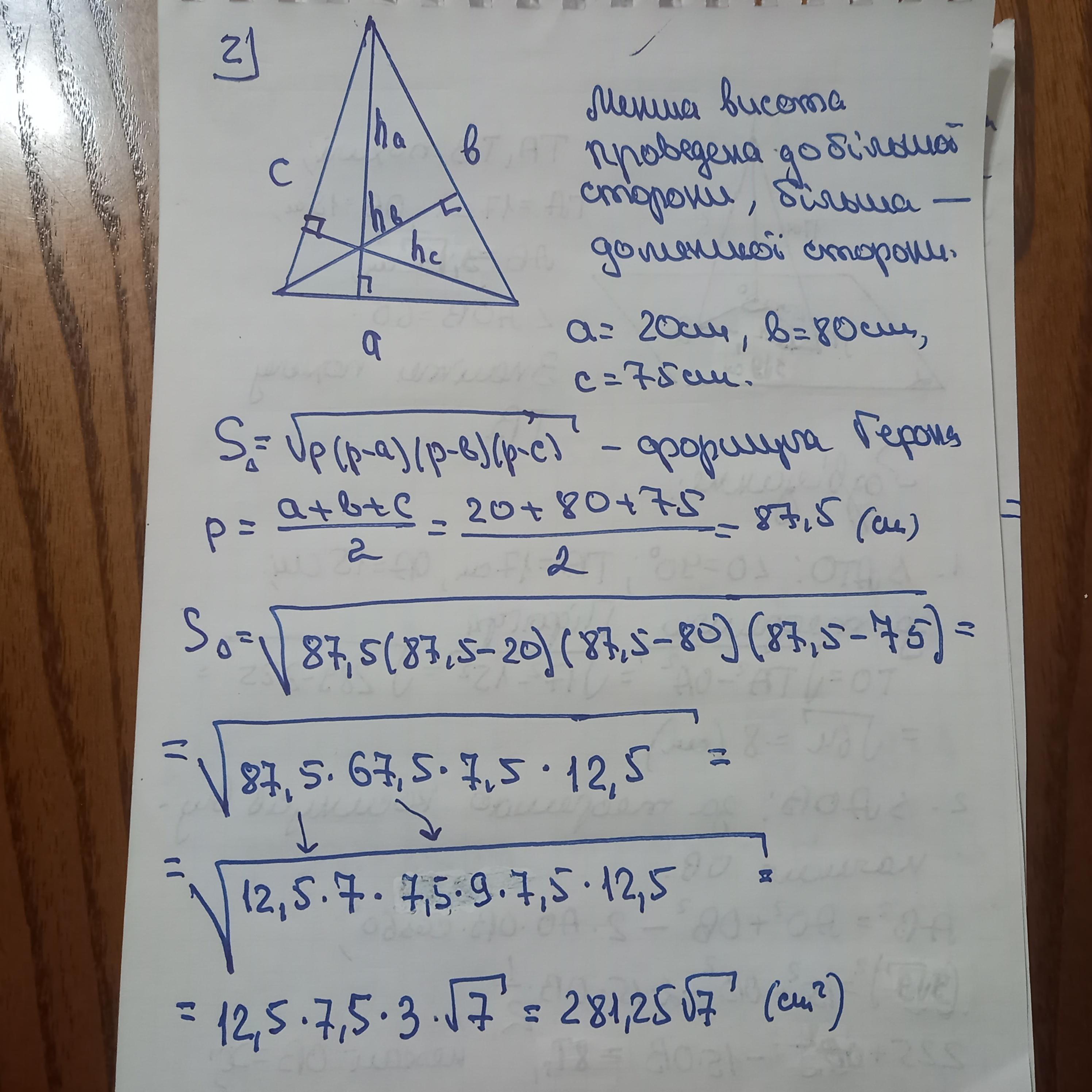 2.Сторони трикутника дорівнюють 20 см, 80 см і 75 см. Знайдіть висоти трикутника