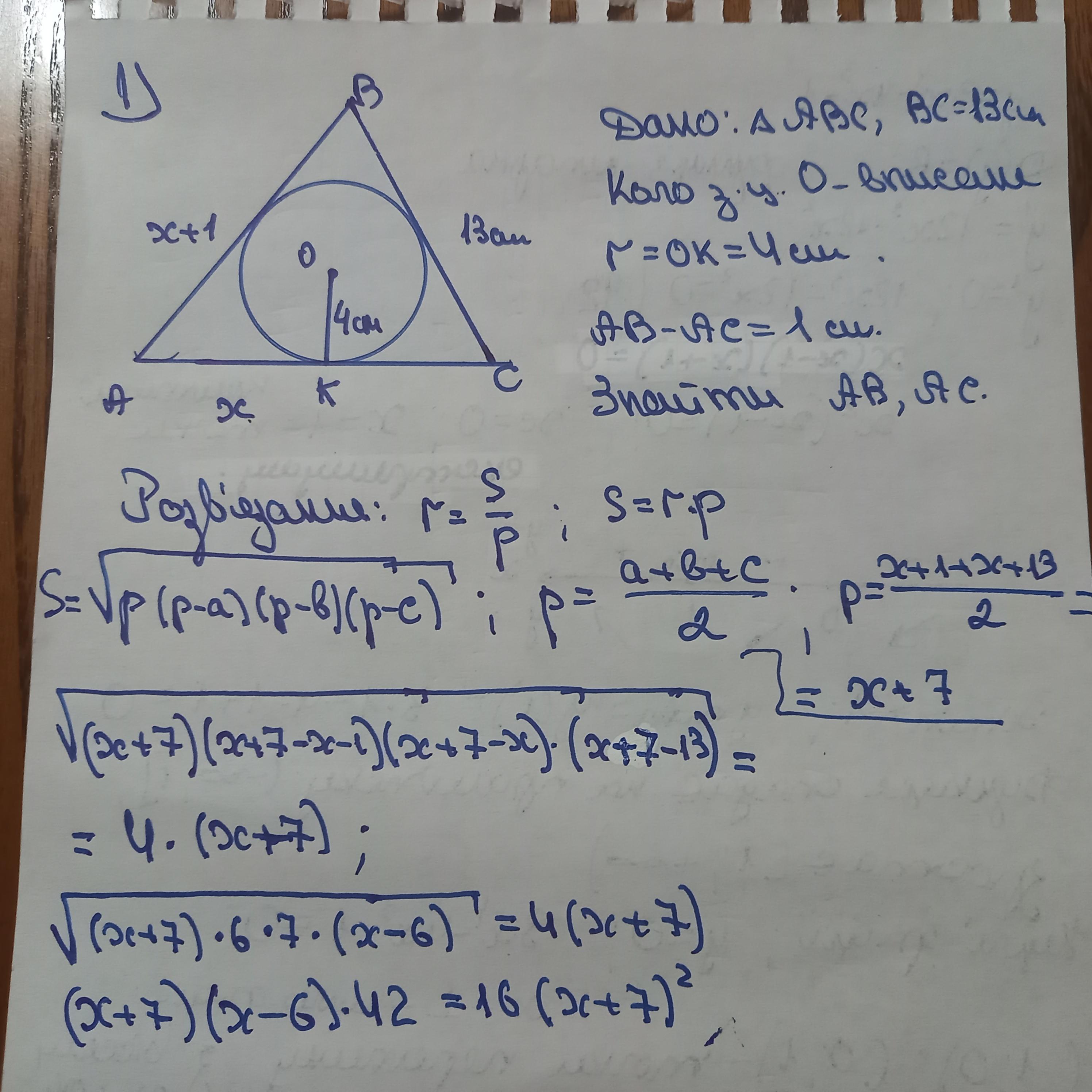 1. У трикутнику одна зі сторін дорівнює 13 см, а різниця двох інших – 1 см. Знайдіть ці дві сторони, якщо радіус кола, вписаного в трикутник, дорівнює 4 см.