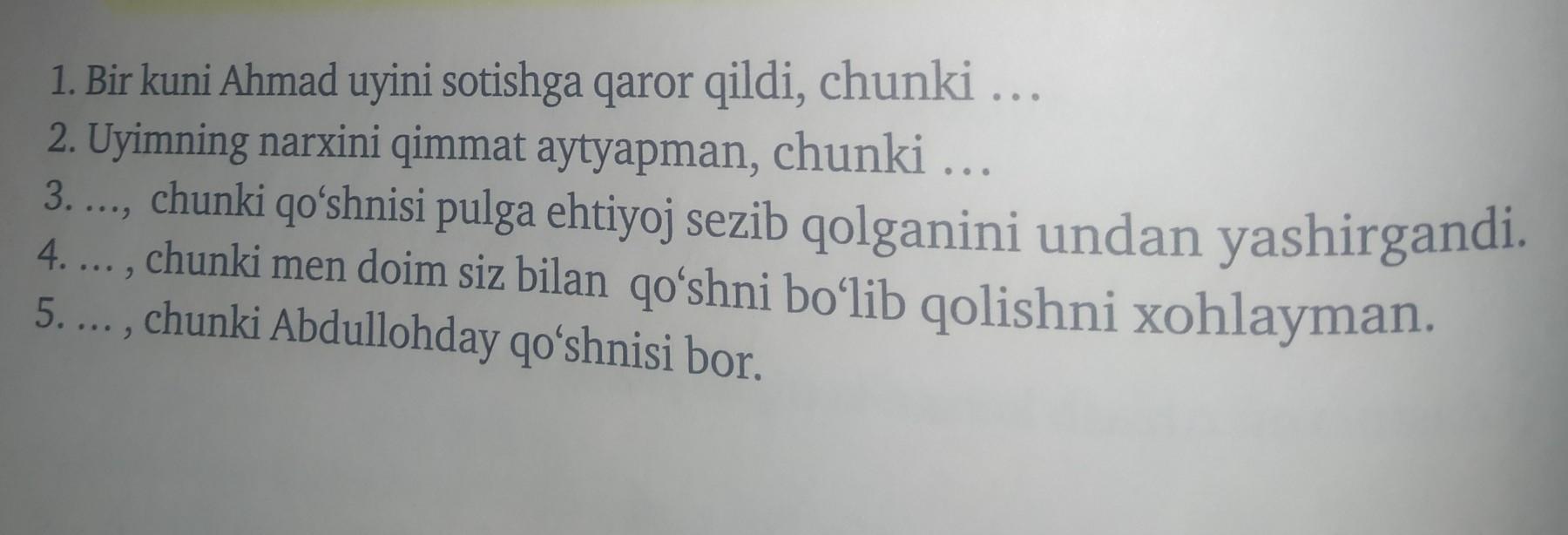 Namuna: Bir kuni Ahmad uyini sotishga qaror qildi, chunki u pulga muhtoj bo'lib qoldi 1. Bir kuni Ahmad uyini sotishga qaror qildi, chunki ... 2. Uyimning narxini qimmat aytyapman, chunki ... 3...., chunki qo'shnisi pulga ehtiyoj sezib qolganini undan yashirgandi. 4...., chunki men doim siz bilan qo'shni bo'lib qolishni xohlayman. 5. ..., chunki Abdullohday qo'shnisi bor.