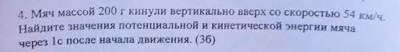 4. Мяч массой 200 г кинули вертикально вверх со скоростью 54 км/ч. Найдите значения потенциальной и кинетической энергии мяча через 1с после начала движения. (36)