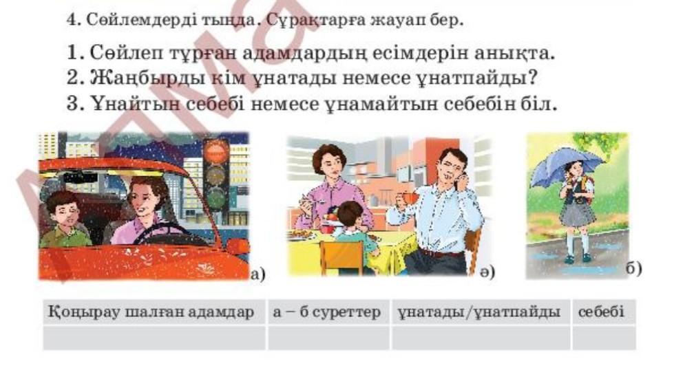 4. Сөйлемдерді тында. Сұрақтарға жауап бер. 1. Сөйлеп тұрған адамдардың есiмдерiн анықта. 2. Жаңбырды кім ұнатады немесе ұнатпайды? 3. Yнайтын себебі немесе ұнамайтын себебiн бiл. б)