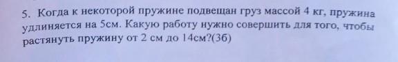 5. Когда к некоторой пружине подвещан груз массой 4 кг, пружина удлиняется на 5см. Какую работу нужно совершить для того, чтобы растянуть пружину от 2 см до 14см?(36)