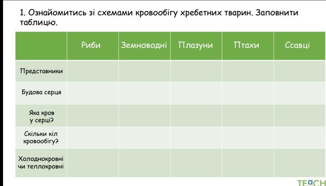 1. Ознайомитись зі схемами кровообігу хребетних тварин. Заповнити таблицю. Представники Будова серця Яка кров у серці? Скільки кіл кровообігу? Холоднокровнi чи теплокровні Риби Земноводнi Плазуни Птахи Ссавці TEAC