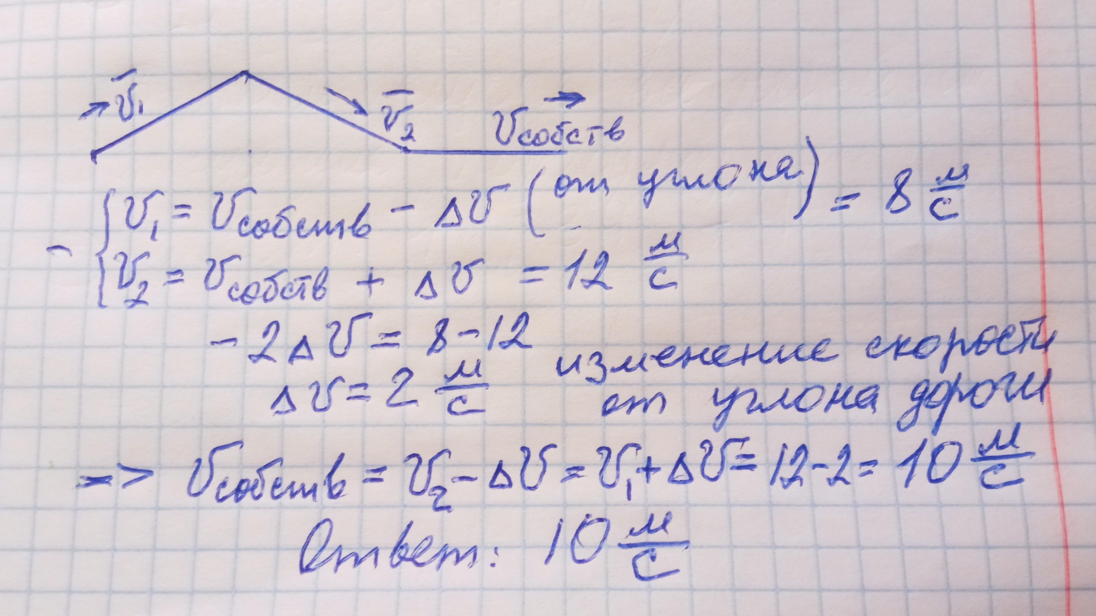 Автомобиль движется в гору, уклон которой малый, со скоростью 8 м/с, спускается по той же дороге со скоростью 12 м/с. С какой скоростью будет двигаться автомобиль по горизонтальной дороге, если коэффициент сопротивления и мощность двигателя не меняется?