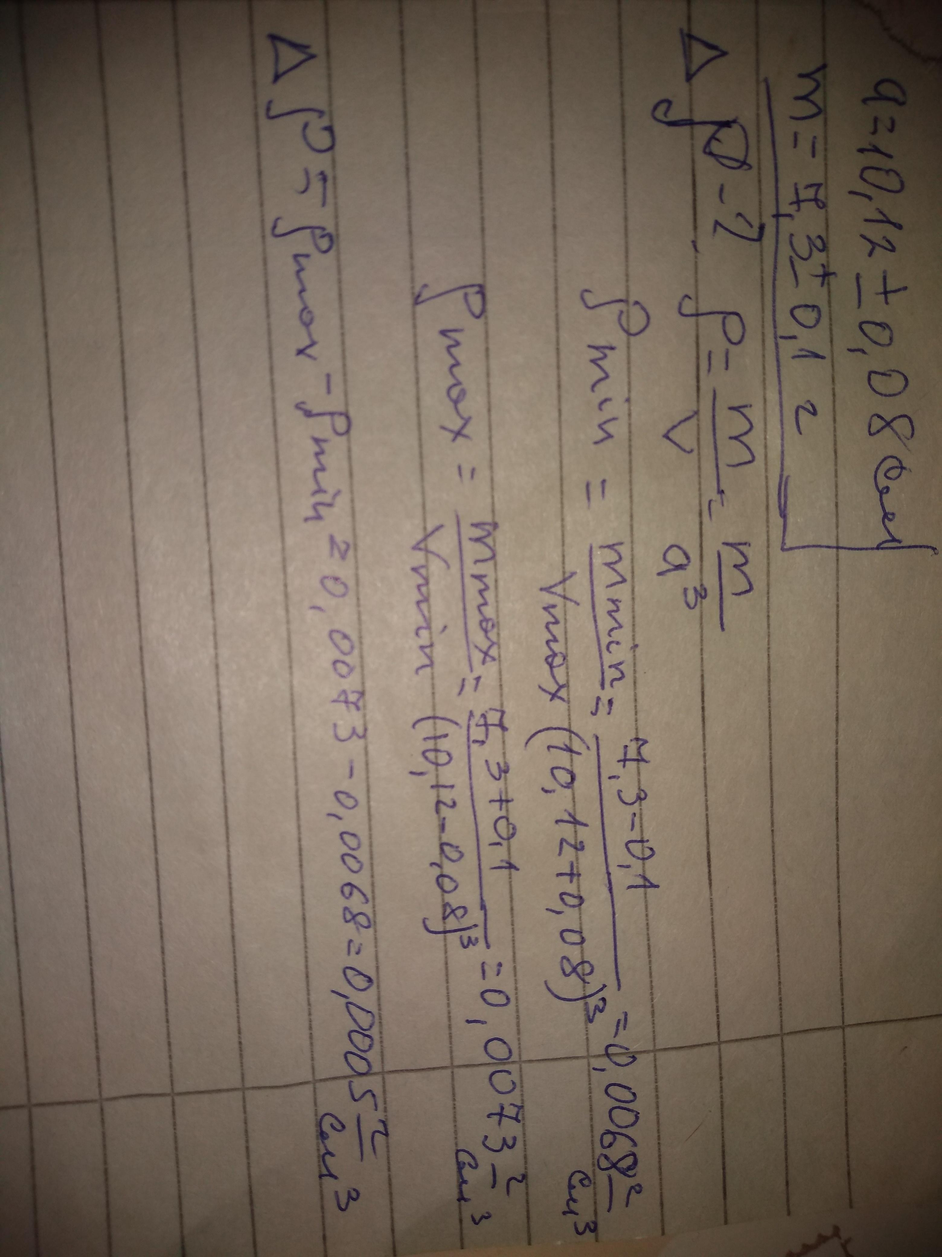 вычислить предельную абсолютную погрешность измерения плотности куба,если его ребро а=(10.12 +- 0.08)см, а масса м=(7.3 +- 0.1) г