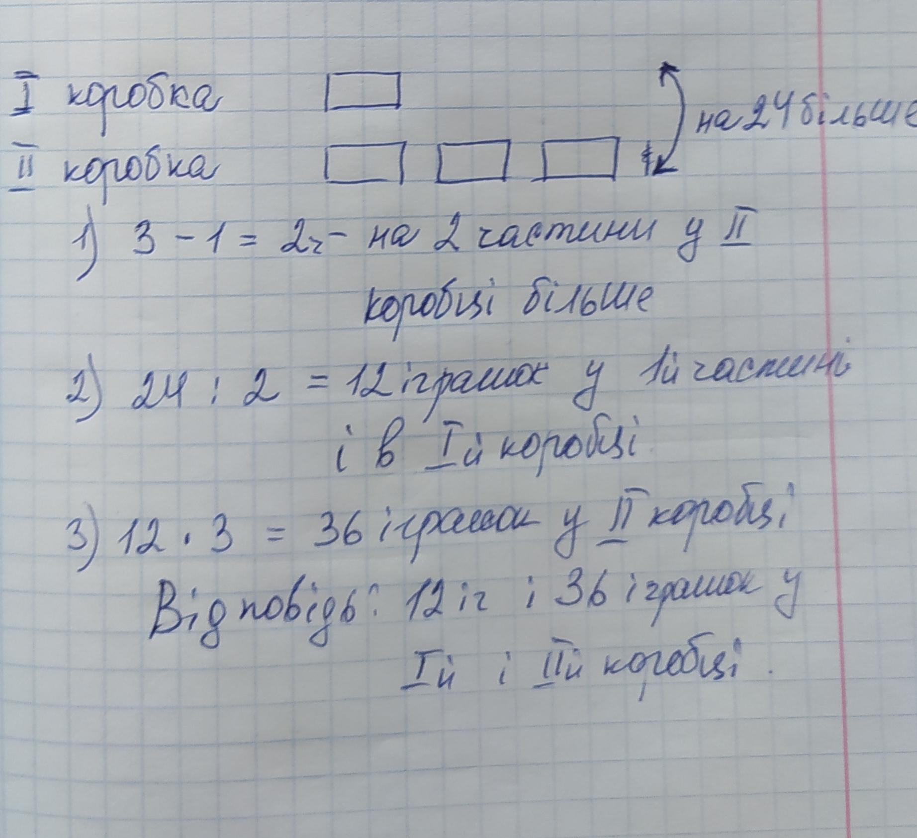 2 Розв'яжи задачу. Скорочений запис зроби за допо могою відрізків. Розбираючи новорічну ялинку, Улянка з мамою скла- дали прикраси у дві коробки. Скільки прикрас у кожній коробці, якщо в першій їх утричі менше, ніж у другій, а у другій коробці прикрас на 24 більше, ніж у першій