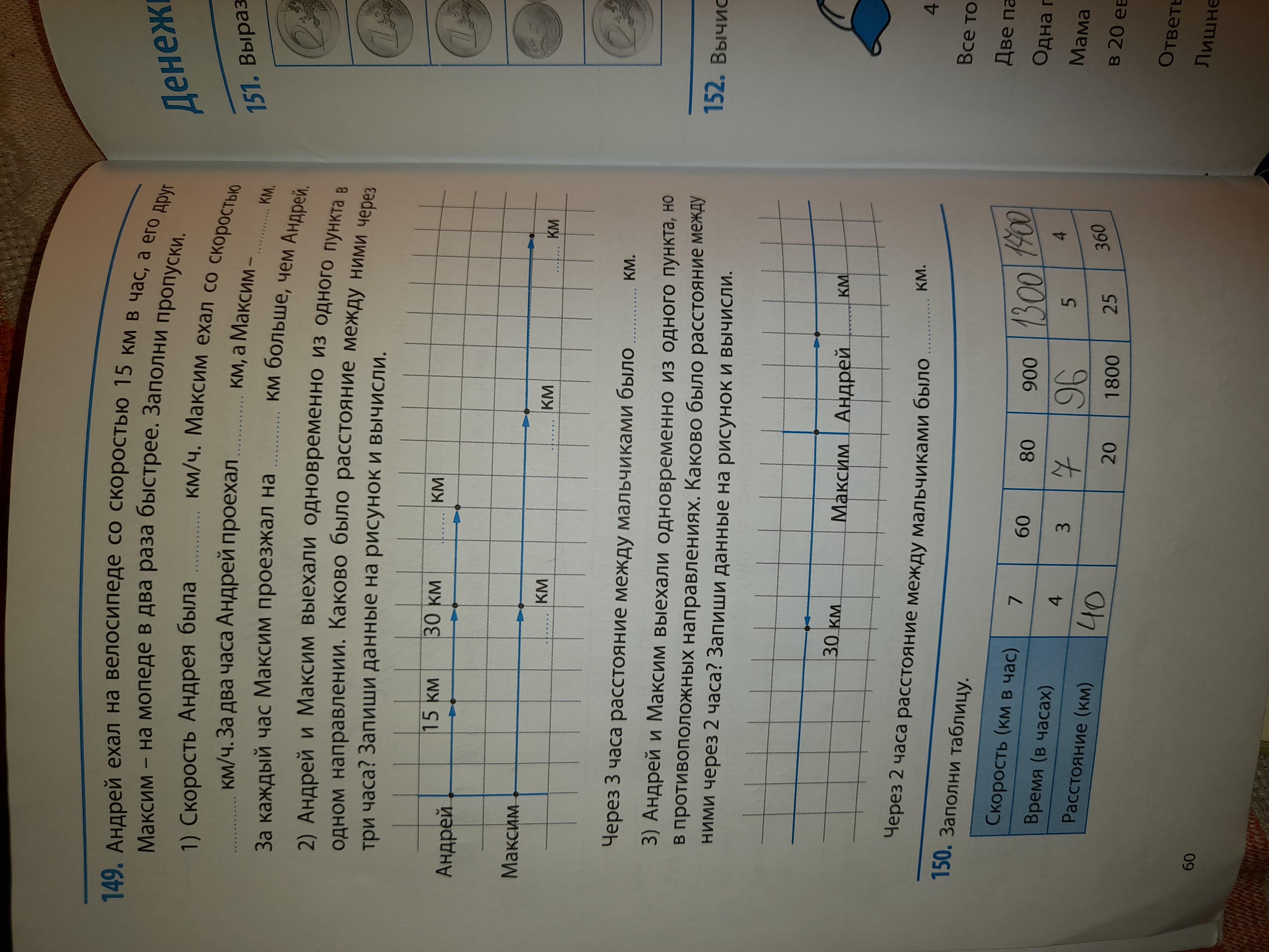 Андрей и Максим выехали одновременно из одного пункта в одном направлении. Каково было расстояние между ними через три часа? Запиши данные на рисунок и вычесли. Задание номер 149 под номером (2)