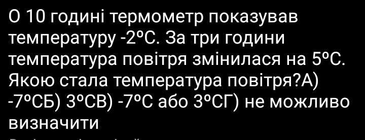 O 10 годині термометр показував температуру -2°C. За три години температура повітря змінилася на 5°С. Якою стала температура повітря?А) -7°СБ) 3ºСВ) -7°С або 3°СГ) не можливо