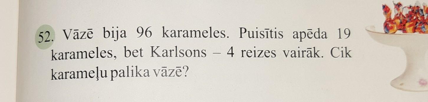 я могу перевести в вазе было96 карамелей мальчик съел 19 карамелей а Карлсон в 4 раз больше СК осталось в вазе?