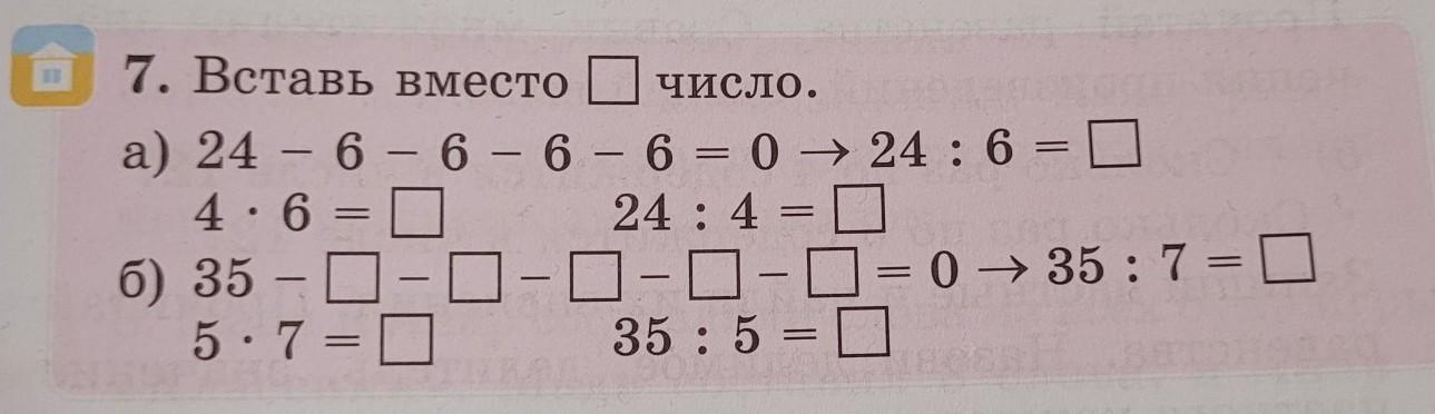 7. Вставь вместо число. a) 4-6= = 24-6-6-6-6=0→24 24 : 4 = D-D-D=0 → 35 : 7 = [ 35 : 5 = 6) 35- - 5.7= - : - 6 =