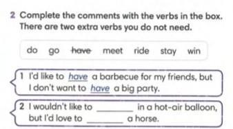 Ответ:Ответ:2. I wouldn't like to go in hot-air balloon, but i'd love to ride a horse.